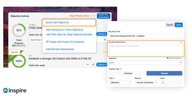 - Quick Add Objective to streamline OKR creation and reduce setup time